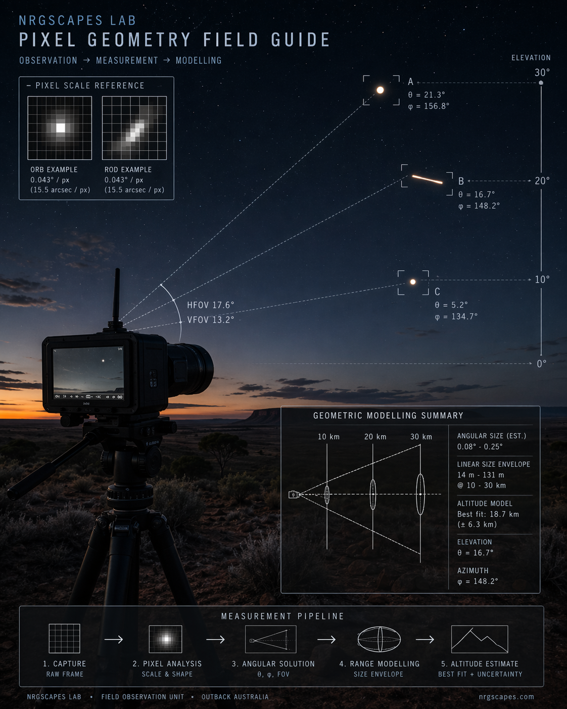 NRGscapes LAB’s Pixel Geometry Field Guide establishes a practical measurement workflow for converting single-camera UAP orb and rod imagery into defensible geometric data. The method links camera specifications, field-of-view values, native frame resolution, pixel measurements, tripod height, camera tilt, and vertical frame offsets to calculate angular size, linear size envelopes, and elevation or altitude bands. Rather than claiming exact distance, size, or altitude, the guide emphasises transparent uncertainty handling, range-based modelling, and careful field-to-paper reporting suitable for journal methods sections and reviewer scrutiny.